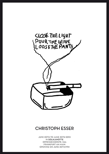 Close the light, Pour the wine, Loose the pants click images to enlarge All works © by Christoph Esser Sharen mit: Klicke, um auf X zu teilen (Wird in neuem Fenster geöffnet) X Klick, um auf Facebook zu teilen (Wird in neuem Fenster geöffnet) Facebook Gefällt mir Wird geladen …